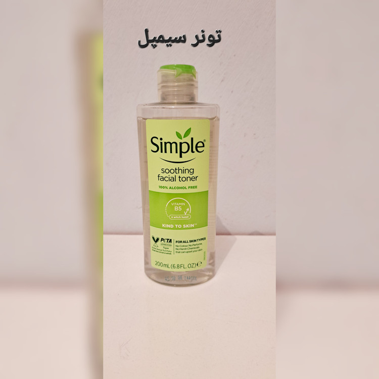 تونر سیمپل | Simple Soothing Facial Toner توضیح کوتاه: تونر ملایم و بدون الکل سیمپل، مناسب انواع پوست حتی حساس، با فرمول وگان و ضد حساسیت. توضیح کامل: تونر سیمپل یک تونر فوقالعاده سبک و ملایم است که بعد از شستوشوی صورت، پوست را کاملاً تمیز، شاداب و آماده دریافت آبرسان یا کرم میکند. این محصول بدون الکل، عطر مصنوعی و مواد مضر ساخته شده و با ترکیبات طبیعی مثل: ویتامین B5 (تقویت و ترمیم پوست) بابونه و فندق افسونگر (Witch Hazel) (آرامشبخش و ضد التهاب) آلانتوئین (نرمکننده و تسکیندهنده) باعث میشود پوست رطوبت طبیعی خودش را حفظ کند و منافذ صورت بهتر پاکسازی شوند. ✅ مناسب انواع پوست (حتی حساس) ✅ بدون الکل، بدون عطر مصنوعی ✅ وگان و بدون تست حیوانی ✅ آمادهسازی عالی پوست قبل از روتین پوستی روش مصرف: 1. بعد از شستن صورت با شوینده، مقدار کمی از تونر را روی پد آرایشی یا پنبه بریزید. 2. به آرامی روی پوست صورت و گردن بکشید. 3. بعدش آبرسان یا کرم مرطوبکننده بزنید. ۴.